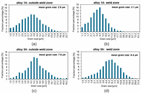 Results of statistical analysis of grain size: (a,b) alloy 1 A ((a)—outside the weld zone; (b)—weld zone); (c,d) alloy 3A ((c)—outside the weld zone; (d)—weld zone).