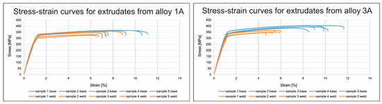 Stress–strain curves for AlMgSi(Cu) alloy extrudates from static tensile test: the base material and the material from the weld zone.