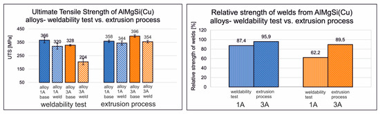 Ultimate tensile strength of AlMgSi(Cu) alloys (on the left) and relative strength of welds from AlMgSi(Cu) alloys (on the right)—according to the weldability test and extrusion process.