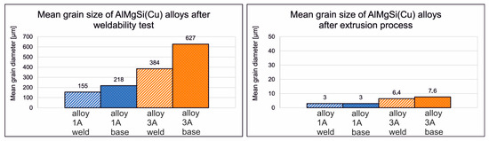 Mean grain size of AlMgSi(Cu) alloys according to the weldability test (left) and extrusion process (right).