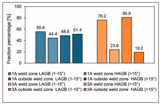 Figure 23 compares the percentage of low-angle grain boundaries (LAGB, 1–15°) and high-angle grain boundaries (HAGB, >15°) in two profiles extruded from 1A and 3A alloys. The data are presented both for the weld zone and outside the weld zone. The profile extruded from the 1A alloy has a more balanced distribution between LAGB and HAGB both inside and outside the weld zone. The percentages for LAGB and HAGB are relatively close in both regions. On the other hand, the profile extruded from alloy 3A shows a dominance of LAGB in both regions. In alloy 1A, the proportion of LAGB in the weld zone is approximately 55.6%, whereas the proportion of HAGB is approximately 44.4%. In the area outside the weld zone, the proportion of HAGB is higher and is approximately 51.4%. In the case of the extruded alloy 3A profile, low misorientation angles dominate both in the welding area and outside the welding area. In the weld zone, the proportion of LAGB is about 76.2%, while outside the weld zone the proportion of LAGB is higher and is about 80.8%.