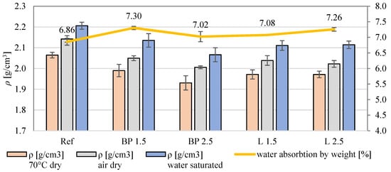 In Figure 2, the average values of the densities of the tested mortars are presented. The dry density of all mortars with the addition of biowaste is lower than the density of the reference one. The most significant decreases in density were observed in mortars with biowastes BP 2.5 and L 2.5, which differ by approximately 4.5% compared to the reference mortar. The reduction in density is due to the lower mass of biowaste than the mineral aggregate used in the reference mortar.