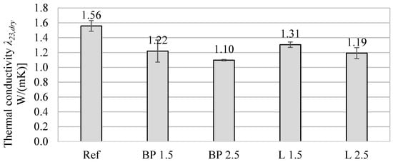 After 90 days of curing and conditioning the specimens in laboratory air-dry conditions, the differences in thermal conductivity are smaller. This is because the composites with the bio-powders have higher sorption properties, thus absorbing more water vapor from the air. As a result, its thermal conductivity was higher than after 28 days.