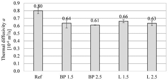 In turn, the thermal diffusivity of all mortars with the addition of bio-powders is lower by approximately 17–23%, depending on bio-additive content. This is mainly caused by the lower thermal conductivity of composites with biowaste.