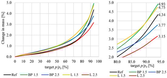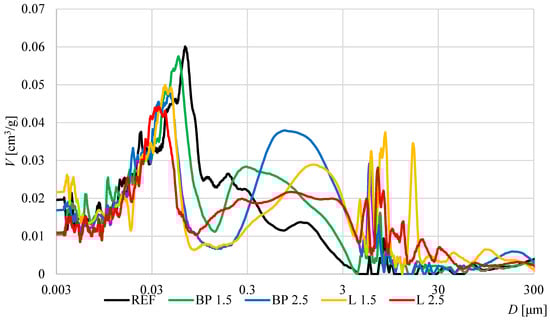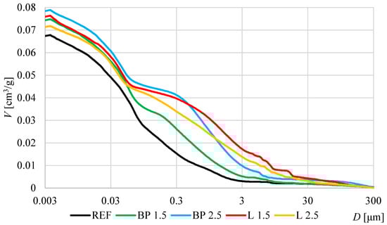 The porosimetry results are presented in Figure 6 and Figure 7 and Table 5. In all composites with the addition of bio-powders, a significant increase in pore content was observed compared to the reference mortar. In the case of black pine powder, a correlation is visible between the increase in porosity and the additive content.