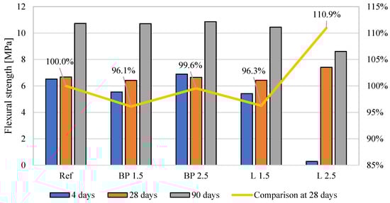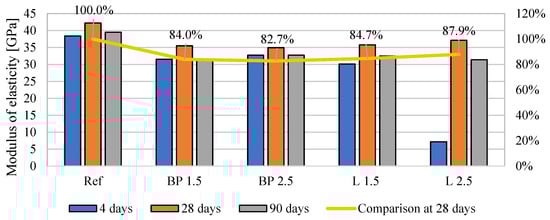 When comparing the effect of density on mechanical properties, the expected tendency was observed in which, with the decrease in density caused by the use of bio-powders, the compressive strength after 28 days of curing and the modulus of elasticity was lower than in the reference mortar (Figure 17). However, such a relationship was not observed in the case of flexural strength. After adding the powders, their effect on strength was neutral.