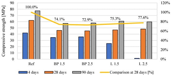 The compressive strength of the mortar was assessed in accordance with PN-EN 196-1 []. The standard specified a uniform load increase at a rate of 50 to 500 N/s, which was to be selected so that material failure occurred within a timeframe of 30 to 90 s. The arithmetic mean of all tested specimens (in this case, six) was considered reliable. Additionally, the determination of compressive strength was performed consecutively at 4, 28, and 90 days following the preparation of the specimens.