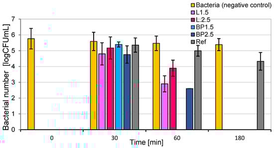 Concrete plates 50 × 50 mm were sterilized under a UV-C lamp for 15 min. All specimens were placed into a sterile buffer in 250 mL screw-cap Erlenmeyer flasks. Then, 50 ± 0.5 mL of the working dilution of the prepared bacterial inoculum was added to the flask. The flask containing only bacterial solution was used as a negative control. The flasks on the wrist-action shaker at 37 °C were shaken at a maximum stroke for 3 h. An amount of 0.5 mL was taken as a sample after 0.5 (30 min), 1 (60 min), and 3 h (180 min). Bacterial concentration at the “0” time and during the experiment was measured by serial dilutions and standard plate-count techniques in triplicate. Plate Count Agar (BIOCORP Sp. z.o.o., PL, Skibicka 5, 02-269 Warszawa) was used. All Petri dishes were incubated at 37 ± 2 °C for 24 h. The visible bacteria colonies were counted and reported as colony-forming units per milliliter (CFU/mL). The logarithmic (log) bacteria reduction was calculated from the initial “0” time.