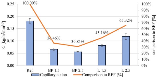where C—water absorption coefficient [kg/m2·min0.5], M1—specimen’s weight after soaking for 10 min [g], and M2—specimen’s weight after soaking for 90 min [g].