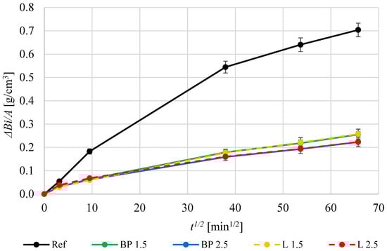 The water absorption of all mortars with the addition of biowastes is higher than the water absorption of the reference mortar. The difference is the largest for mortars BP 1.5 and L 2.5, which are approximately 6% higher than in the REF. Increased water absorption may be caused by greater porosity of mortars with the addition of biowaste. This porosity may result from the breakdown of biowaste during the mixing and hydration process of the mortar and the formation of free spaces in the contact zone between the cement matrix and the additive. The results presented in the graph are consistent with the results of other studies on biomass’s impact on mortars’ properties. For example, the study [] found that adding 5% biomass to cement mortar reduces its density by about 5% and increases water absorption by about 10%.