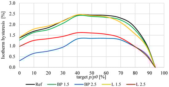 This test was conducted in accordance with the EN ISO 12571 standard []. The automated methods utilized for determining sorption isotherms serve as equivalents to traditional techniques []. Specifically, devices such as a Dynamic Vapor Sorption apparatus (DVS) (Surface Measurement Systems GmbH, Im Breitspiel 21, 69126 Heidelberg, Germany, https://surfacemeasurementsystems.com/contact/) were employed to generate moisture []. The apparatus monitored the change in mass over time (dm/dt) to ascertain the duration required to achieve equilibrium. When dm/dt approached zero, the system automatically adjusted to the subsequent humidity level. An air temperature of 20 °C and a relative humidity range of 0–97% were established, with humidity levels incremented by 10%. Each time the software detected a mass change of less than 0.0005% per minute, the relative humidity was automatically modified by 10%. Prior to testing, the specimens were dried to a constant weight at 70 °C, with an initial weight of approximately 150 µg. To ensure dry conditions at the commencement of the measurement, the test began with 12 h of sorption drying at a 0% humidity level within a nitrogen atmosphere.