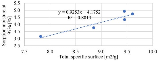 Relationship between total specific surface and sorption moisture obtained at 97% of air humidity.