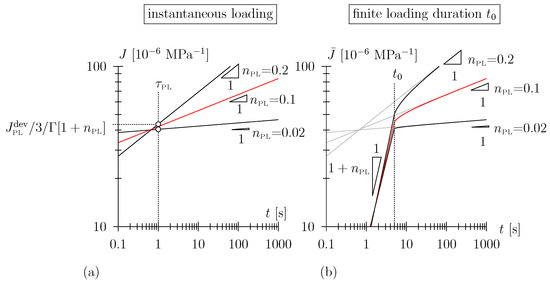 (a) Creep compliance , cf. Equation (4) (in log-log scale) of Scott Blair element with = 120 × and = 1 s, (b) ramp compliance , cf. Equations (A1) and (A2) considering a finite loading duration = 5 s (note that in (b) the ramp compliance has been superimposed with the compliance function (in gray) for better comparability.)