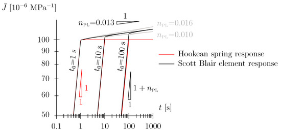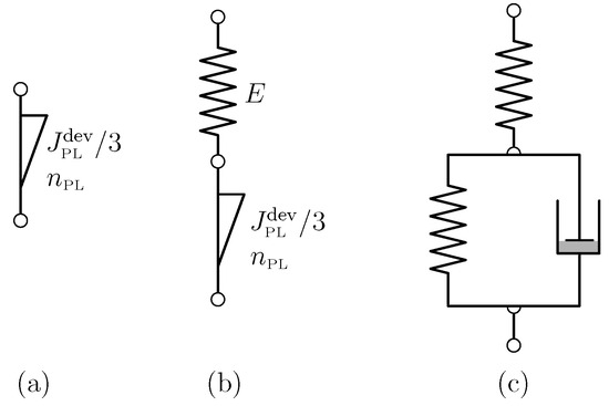 with material parameters [], the power-law compliance parameter and [–], the power-law exponent; [s] is an arbitrarily chosen time constant making the bracket term non-dimensional and was set to 1 s in this paper (for details see [11]). Here, we suppose that the creep process is caused by the deviatoric stress component only; hence, the volumetric creep is neglected. Note that the root-like function for , with an ever-decreasing creep rate, yields a compliance characterized by a vertical tangent at , i.e., , i.e., there is a quasi-instantaneous response upon a step change in the applied stress depicted by this constitutive element. Further, note that the Scott Blair element reduces to a (deviatoric) Newtonian damper with viscosity of for = 1. For a Hookean spring is recovered with Young’s modulus . In this way, via the exponent , the Scott Blair element is able to represent a continuous spectrum ranging from pure Hookean spring-like behavior to pure Newtonian damper-like behavior; the smaller the exponent, the more spring-like the behavior.
