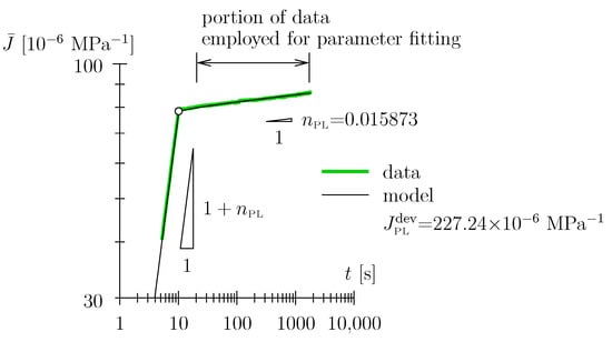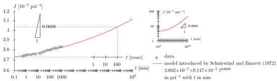 - We have already addressed the nonlinear Maxwell model employed by [9] to some extent. An additional point to mention is that the introduction of the Hookean spring leads to a seemingly ever-increasing slope in the log-log diagram; the prescribed power-law exponent of the Scott Blair element = 0.0608 is reached only after a ridiculously long time span (see small inlay in Figure 4). The allowance of this quasi-ever-increasing slope (in the log-log diagram in terms of engineering application of the model), with the associated implication on the long-term behavior of the order of days or weeks (or even months), i.e., prediction of material behavior, seems, in our estimation, to be too bold a statement to be made based upon the underlying data.