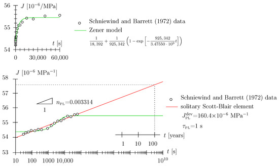 It may seem counter-intuitive to abstain from employing a Hookean spring entirely (this is what we do when employing a solitary Scott Blair element; see Section 2.4 and Figure 1 and Figure 2). However, recall the quasi-Hookean nature of the Scott Blair element for low numbers of the exponent. As regards the use of the nonlinear Maxwell model, one may object that a certain material behavior is assigned in a time range (e.g., zero to 0.5 min) where there is no support from experimental data. With the advent of experimental means allowing detailed monitoring, i.e., high-resolution data logging of the loading phase and the initial holding phase, as will be used in the present paper, there is the possibility to more rigorously assess the quality of the employed viscoelastic models. Based on the Schniewind and Barrett data [9] presented in Figure 4 and Figure 5, one cannot objectively assess which viscoelastic model represents the data in the best way: