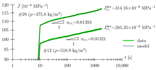This may indicate, besides the fact that the data clearly linearizes in a log-log diagram, that solitary Scott Blair based modeling, with no need for the assignment of a Hookean spring, seems highly appropriate. This is not only true for clear spruce wood (Figure 6), but also for the investigated material modification, i.e., for compression wood (Figure 7).