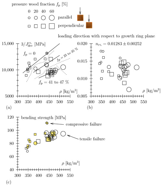 (a) Power-law stiffness, (b) exponent, and (c) bending strength as a function of the dry density, loading direction, and compression wood content, respectively.