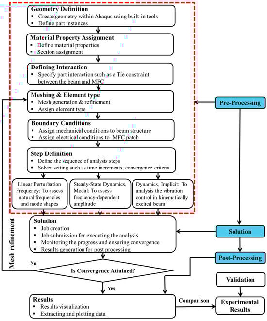 In Figure 1, three main steps involved in the numerical simulation are illustrated: pre-processing, solution, and post-processing. In the pre-processing step, the geometry of the beam structure with the MFC is created and defined. The material properties are assigned to the beam and MFC separately, interaction is established between them, element types are assigned, and meshing is performed. Then, boundary conditions are applied, followed by defining various analysis steps such as linear perturbation frequency (to assess natural frequencies and mode shapes), steady-state dynamics (to assess frequency-dependent amplitude), and dynamics implicit (to analyze vibration control with MFCs).