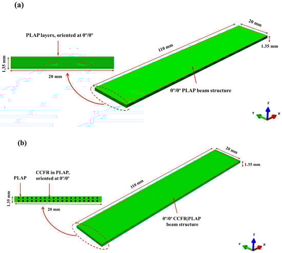 Modeling beam structures oriented at 0°|0°: (a) approach for PLAP and SCFR|PLAP beam structures and (b) approach for CCFR|PLAP.