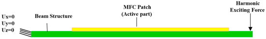 The force () produced by the MFC operates in opposition to the external harmonic force and effectively reduces the vibration amplitude in the beam structure. The damping matrix , incorporated in the Equation (13), inherently encompasses the internal friction and other energy dissipative effects that are crucial to damp vibration amplitude in the beam structure.