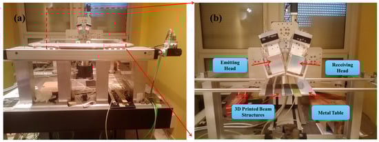 The spectrometer facilitates the determination of sample parameters within the THz frequency range and is capable of scanning samples in either reflection or transmission mode. Its imaging capability allows for the measurement of samples up to 700 mm × 700 mm in size. For the investigation, each beam structure, with dimensions of 120 mm × 20 mm × 1.35 mm, was placed on a metal table and examined in reflection mode. The measuring heads were configured with a 22° angle between them, as presented in Figure 5b. Since THz radiation is significantly affected by moisture, the investigation was conducted using an air dryer to minimize moisture around the measuring heads and an air conditioner to maintain an ambient temperature of 20 °C. The scanning step was set to 0.2 mm in the xy plane, and THz signals were recorded with 10 averages.