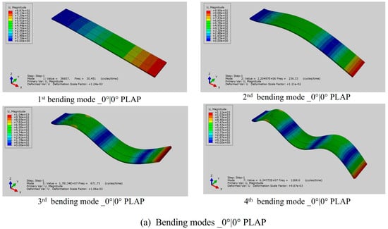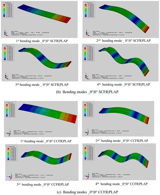 Initial four bending modes of MFC-integrated 0°|0°-oriented beam structures: (a) bending modes _0°|0° PLAP, (b) bending modes _0°|0° SCFR|PLAP, and (c) bending modes _0°|0° CCFR|PLAP.