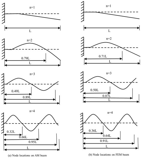 Several factors could contribute to discrepancies between the modal frequencies of the FEM and actual AM beam models. Firstly, the geometry of the AM beam could differ slightly from the idealized numerical model used in Abaqus. This difference might be due to internal irregularities such as defects that are not perfectly considered in the numerical model. Secondly, defining boundary conditions in the numerical model with simple assumptions could lead to inconsistencies with experimental results. For instance, in the numerical simulation, the beam structure is confirmedly fixed at one end, while in real conditions (experiments), there is a possibility that the beam was not firmly fixed, leading to a lack of consistency with the numerical model. To further investigate this, the node locations of the first four bending modes of one of the AM beams and its corresponding numerical model, specifically CCFR|PLAP with MFC, have been determined and presented in Figure 7. In the AM model, the node locations were identified using the 3D laser vibrometer, while in the numerical, the Abaqus platform was used. It can be clearly noted from Figure 7 that the beams vibrate very close to the fixed side, especially in the 2nd, 3rd, and 4th bending modes of both the AM and numerical models. There is a possibility that the AM beam was not firmly fixed, and displacement from the fixed end occurred during vibrating conditions.