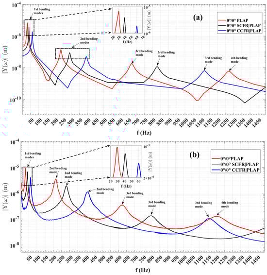 The frequency-dependent dynamic response (amplitude spectrum) of each beam structure (PLAP, SCFR|PLAP, and CCFR|PLAP) with layers oriented at 0°|0° was assessed across a frequency spectrum and subjected to dynamic loading conditions. One side of the beam structure was firmly fixed, while the harmonic excitation force was applied to the free-end side, as exhibited in Figure 4.