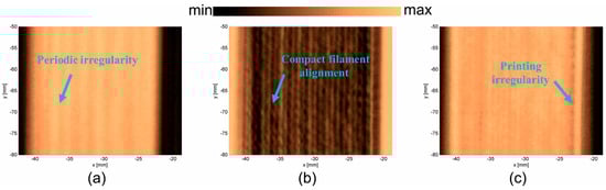 C-scans were determined for three samples and presented in Figure 9a–c. In each case, three surfaces were determined: the upper surface of the sample, the bottom surface of the sample, and the image obtained from the metal table. In the case of PLAP (Figure 9), the image of the upper surface (Figure 9a) presents its periodic irregularity. The image of the bottom surface (Figure 9b) shows that the sample was manufactured from thin PLAP filament lines that were aligned so closely together they were not visible using the ‘naked eye’. Such internal structure influences the vibration properties of the material. The image obtained from the metal plate (Figure 9c) contains information about both the material’s periodic irregularity (probably due to the PLAP filaments in consecutive layers not being perfectly aligned) and the joint PLAP filaments creating the structure.