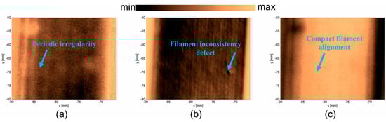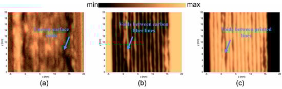 The non-destructive C-scanning of beam structures was performed to identify internal defects using the THz spectrometer (TPSTM Spectra 300 THz Pulsed Imaging and Spectroscopy from TeraView), as presented in Figure 5a. This high-tech instrument employs terahertz (THz) radiation to analyze samples made from various materials. The unique characteristics of THz radiation enable it to penetrate samples, making it effective for non-destructive testing and imaging. The applicability of the NDT technique is primarily limited to the inspection of non-conductive materials, such as polymers [] or glass fiber-reinforced polymers []. Its main advantage is the low power (below 1 µW []) generated by a THz wave that reduces the risk of destroying sensitive materials. THz waves are totally reflected by conductive materials. CCFR structures contain conductive carbon fibers reinforced in a non-conductive polymeric matrix. The applicability range of the NDT method for CCFR strongly depends on the carbon fiber content. For instance, CCFR laminates manufactured using infusion method have a high fiber content (typically 60–70% of total weight []). In such case, THz spectroscopy can be used to detect coatings (e.g., contaminations, thickness variation []) or surface damage (e.g., burn []). A comparative analysis of the influence of different carbon fiber alignments in CCFR laminates on THz wave penetration depth is thoroughly presented by authors []. In the analyzed CCFR|PLAP samples, the fiber content is significantly lower, approximately 18%. This lower amount of conductive material (carbon fiber) allows THz spectroscopy to inspect the whole structure.