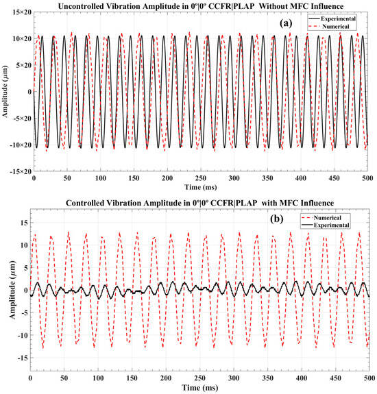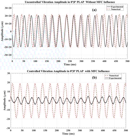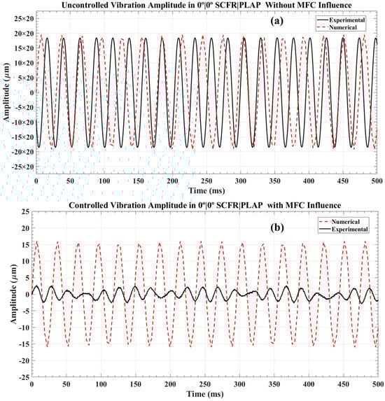 For the SCFR|PLAP numerical model, the uncontrolled highest vibration amplitude was observed around ±395 µm when subjected to a harmonic force near its first resonant frequency of 40 Hz, as depicted in Figure 13a. In experiments with the AM model, the uncontrolled amplitude was noted around ±370 µm at its first resonant frequency of 40.5 Hz. Upon applying a counterforce through the MFC, the controlled numerical and experimental vibration amplitudes were observed around ±16 µm and ±3 µm, respectively, as presented in Figure 13b. This reflects an overall reduction in controlled vibration amplitudes of approximately 25 times and 110 times, respectively.