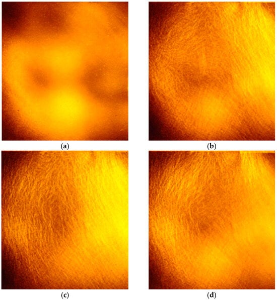 It is evident from the images in Figure 17 that as the load increases, not only does the intensity of the image change, but the extent of the area of increased intensity also varies. In Figure 17b, the area of the increased intensity is relatively narrow, occupying about half the volume of the grain, while in Figure 17o, it covers almost the entire volume of the grain. This indicates that both the high intensity of the image and the area in which it occurs provide valuable information about the stress level. This assumption justifies a similar approach to “force chains” as represented by DEM users—typically, the width of an area is proportional to the value of the normal force acting on the grain.