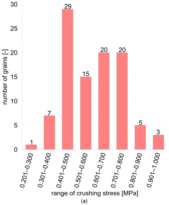In the case of the hardened granulates (Figure 11b), the distribution of the crushing force slightly shifted towards higher values. The largest number of grains (25) was recorded in the range of 0.501–0.600 MPa and 0.601–0.700 MPa.