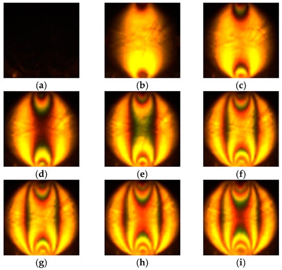 Figure 4 shows photos of the loaded model of this wall taken under the polarization assay. The study area is marked in Figure 3. A clear structure formed by “chains of loaded grains” can be seen emerging as the load increases [33].