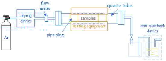 Mg-xCa alloys (x = 1, 3 and 5 wt.%) were melted and cast in an electric resistance furnace under shielding gases (SF6 and CO2) using a graphite crucible and mold, respectively. The alloy ingots were cut and hot rolled into 0.5 mm thick sheets, followed by mechanical and electropolishing, where the electropolishing was carried out in a 1:2 mixture of phosphoric acid and ethanol. The specimens for the oxidation tests were created by punching into discs with a diameter of 5 mm. Subsequently, Mg-xCa alloys were ultrasonically cleaned in acetone and distilled water, respectively. In order to carry out comparative experiments, pure Mg samples were prepared by applying the above experimental steps. Before conducting the oxidation experiment, Mg-xCa alloys were preheated in a high-purity Ar atmosphere (99.9999%) at approximately 0.1 Pa oxygen partial pressure with the experimental installation shown in Figure 1. Prior to the preheating treatment, the samples were placed in the middle of the quartz tubes in the position of the heating unit, and the quartz tubes were air-washed (four times) with a vacuum pump, where the atmospheric pressure inside the quartz tubes was pumped down to about 0.1 MPa during each air washing process. The preheating treatment was carried out at 400 °C for 8 h to ensure that Ca segregated to the surface and Mg did not undergo catastrophic oxidation.