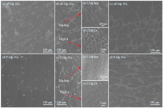 Figure 2 shows the SEM surface morphologies of the uP-Mg-xCa and P-Mg-xCa alloys after the preheating treatment at 400 °C for 8 h in (a–c) and (d–f), respectively. In the not preheated Mg-xCa alloys, Mg-hcp phase of Mg-Ca can be observed with a dark contrast in a granular shape. In the intergranular spacing, the eutectic phase Mg2Ca is found [11,21]. Mg2Ca phase forms in a eutectic reaction (liquid into Mg-hcp + Mg2Ca) that occurs due to the increasing Ca composition in the melt during cooling.