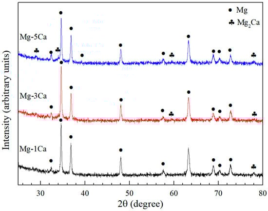 To analyze the phases present in Mg-xCa in Figure 2, Figure 3 shows the XRD patterns of the uP-Mg-xCa alloys, where α-Mg as the major phase and the eutectic phase Mg2Ca are clearly detected in those three alloys. Meanwhile, the number of Mg2Ca reflections rises slightly with the increase in the Ca content. This further demonstrates that the eutectic phase distributed in a network in Figure 2 is composed of Mg2Ca.