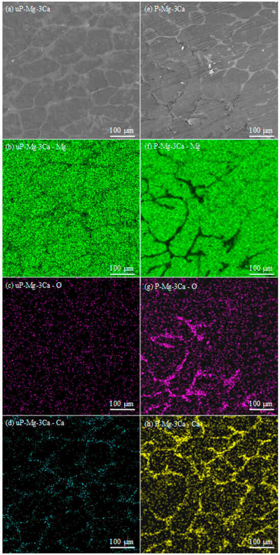 Figure 4 shows the surface morphology SEM images of uP-Mg-3Ca and the corresponding EDS mappings of Mg, Ca and O in (a–d) and P-Mg-3Ca in (e–h). Similar to uP-Mg-3Ca in Figure 4a, the eutectic Mg2Ca phase can also be observed for P-Mg-3Ca in Figure 4e. The EDS mapping results show that the intensity of the Mg signal of uP-Mg-3Ca and P-Mg-3Ca in Figure 4b,f is the highest. For uP-Mg-3Ca, the signals of O in Figure 4c and Ca in Figure 4d can be observed but are somewhat weak. In the regions where the eutectic phase Mg2Ca is located, the signals of Ca and O are relatively stronger. Relative to uP-Mg-3Ca, the signals of O in Figure 4g and Ca in Figure 4h show a significant increase after the preheating, especially in the regions where the eutectic phase Mg2Ca is located. This shows the preferential oxidation of the Ca-rich Mg2Ca phase, and the increase in the intensities of Ca and O in the α-Mg phase is attributed to outward segregation of Ca during the preheating.