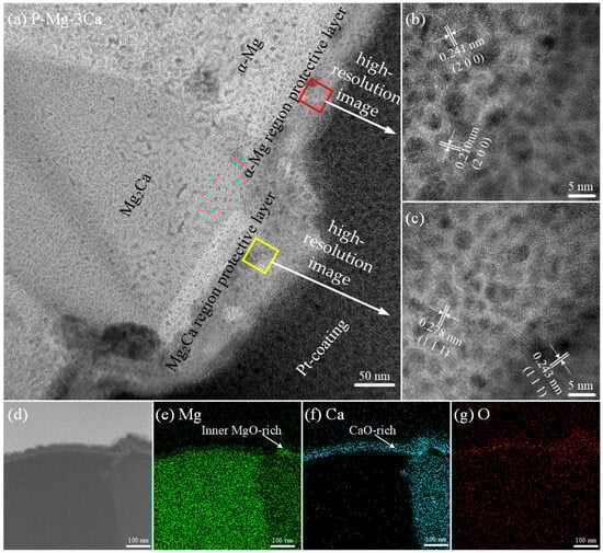 The bright-field (BF) TEM images and high-resolution images of the cross-sectional oxide layer formed in the Mg-hcp region and the eutectic phase Mg2Ca region on the P-Mg-3Ca surface at 400 °C for 8 h are shown in Figure 5a–c. The surface is covered with a composite film, and it is divided into two sublayers, which is dark in the outer sublayer and white-grey in the inner sublayer. The thicknesses of the composite film are different on the Mg-hcp region (40 ± 4 nm thick) and the eutectic Mg2Ca region (47 ± 8 nm thick), but they both consist of MgO and CaO. Oxide grains of MgO with lattice spacing d = 0.210 for (2 0 0) and d = 0.243 for (1 1 1), as well as CaO with d = 0.241 for (2 0 0) and d = 0.278 for (1 1 1), are identified in Figure 5b,c. The STEM images of the cross-section of the protective film with the corresponding element mapping of Mg, Ca and O can be seen in Figure 5d–g. In light of it, the intensity of the Ca signal is strong, especially in the vicinity to the surface, while the Mg signal is somewhat strong only in the inner sublayer. This suggests that the composite protective film on the Mg-hcp region is CaO-rich, while that on the eutectic phase Mg2Ca region is MgO-rich in the inner sublayer but CaO-rich in the outer sublayer.