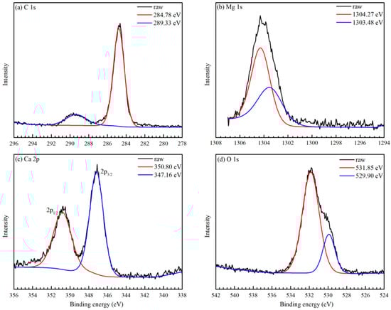 XPS spectra of Mg-3Ca with preheating at 400 °C for 8 h. (a) C 1s, (b) Mg 1s, (c) Ca 2p and (d) O 1s.