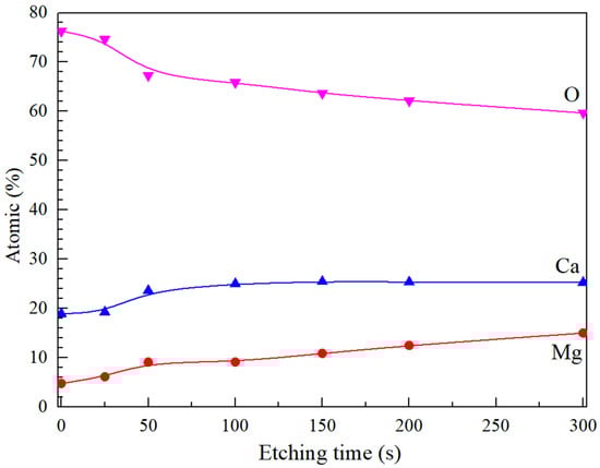The XPS depth profiles of Mg, Ca and O atomic content along the depth direction in Mg-3Ca alloys preheated at 400 °C for 8 h.