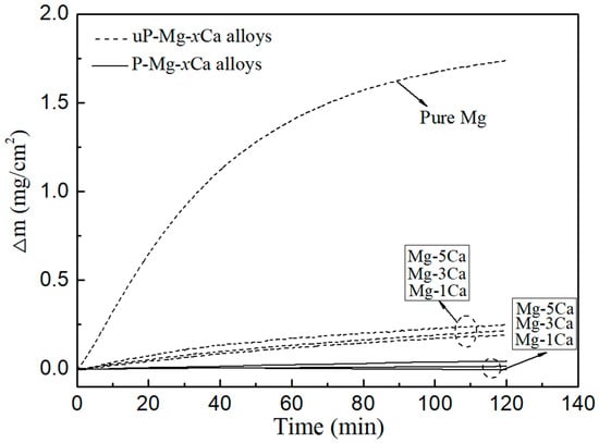 3.4. Oxidation Kinetics of uP-Mg-xCa Alloy and P-Mg-xCa Alloy