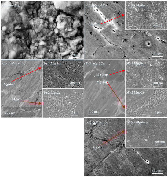 Surface morphologies of uP-Mg-xCa and P-Mg-xCa alloys preheating at 400 °C for 8 h in Ar with uP-Mg-1Ca in (a), uP-Mg-3Ca in (b), uP-Mg-5Ca in (c), P-Mg-1Ca in (d), P-Mg-3Ca in (e) and P-Mg-5Ca in (f). The inserts in (b) uP-Mg-3Ca and (e) P-Mg-3Ca, respectively, are high magnification FESEM images of the Mg-hcp phase in (b)-1 and (e)-1 and the eutectic phase Mg2Ca in (b)-2 and (e)-2.