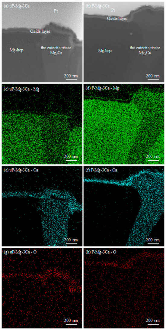 To clarify how the eutectic phase Mg2Ca would influence the growth of the oxide layer, the cross-sectional TEM images of uP-Mg-3Ca and P-Mg-3Ca oxidized for 2 h at 400 °C are shown in Figure 10 with (a) uP-Mg-3Ca and (b) P-Mg-3Ca, and the corresponding distribution of Mg, O and Ca on the cross-section is shown in Figure 10c–h. In (a,b), the Mg-hcp phase and the eutectic phase Mg2Ca can be basically identified with the help of the EDS mapping results in Figure 10c–h, where the Mg signal is weak in the Mg2Ca region but strong in the Mg-hcp region. Moreover, a thin oxide layer that formed on uP-Mg-3Ca and P-Mg-3Ca alloys can be clearly observed, where the signals of Ca and O look somewhat strong, but that of Mg seems relatively weak. In Figure 10a, the surface oxide layer on uP-Mg-3Ca at the Mg-hcp and Mg2Ca positions are significantly different, which is flat with a thickness of ~105 nm at the Mg-hcp position, while it is about 160 nm thick at the Mg2Ca position. After the preheating, the oxide layer thicknesses at the Mg-hcp and Mg2Ca position are both uniform as approximately 80 nm for P-Mg-3Ca, as shown in Figure 10b. As measured in Figure 5, the dense and compact MgO/CaO composite protective film formed on P-Mg-xCa during the preheating are 40 ± 4 nm thick in the Mg-hcp region and 47 ± 8 nm thick in the eutectic Mg2Ca region. By calculation, it is thus clear that the increases in the thickness during oxidation of Mg-hcp and the eutectic phase Mg2Ca are only approximately 40 nm and 33 nm, respectively. This indicates that the preheating process significantly enhances the OR, while the OR at the Mg2Ca position after preheating is slightly stronger than that at the Mg-hcp position, consistent with the mass gain measurement in Figure 8 and the surface morphology observation in Figure 9. However, since the OR at the Mg2Ca position is weaker without the preheating process (as shown in Figure 10a), it indicates that the preheating process enhances the OR of Mg2Ca positions to a more obvious extent.