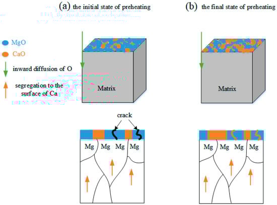The mechanism of the protective layer formation is discussed here with the schematic illustration shown in Figure 11. The remnant O2 partial pressure in Ar atmosphere during the preheating is about 0.1 Pa at 400 °C, which is higher than decomposition pressure of MgO and CaO, generating MgO and CaO simultaneously, as shown in the initial stage of preheating in Figure 11a. However, the PBR of MgO is 0.81, which indicates that some oxygen still diffuses to the substrate surface through the cracks of MgO. After the preheating process, Ca on the surface is gradually consumed by the oxygen reaction, causing the appearance of Ca-poor areas on the surface. Since Ca is the surface-active element, the Ca-poor regions will drive the Ca dissolved in the matrix to segregate to the surface. Meanwhile, Ca reacts with oxygen to form CaO, filling the cracks of MgO. As a result, a dense and compact composite oxide film generated by CaO and MgO covers the Mg-xCa base, as shown in the final state of preheating in Figure 11b. The composite oxide film formed on the eutectic Mg2Ca region is slightly thicker than that on the α-Mg region, which should be ascribed to the large ratio of Ca in Mg2Ca relative to α-Mg. As the oxidation process progresses, the dense protective film inhibits the inward diffusion of oxygen and the outward evaporation of Mg, raising the OR of Mg and its alloys [38].