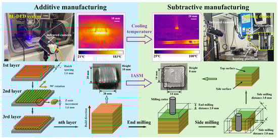 Additive manufacturing is a rapid prototyping technology with high design complexity and degrees of freedom. Directed energy deposition (DED) technology is widely used in industrial manufacturing due to its fast forming speed [1]. During the layer-by-layer repeated printing process of DED, unreasonable printing parameters and complex temperature field evolution in multilayer deposition can easily lead to poor deposition accuracy [2,3]. Poor interlayer bonding and material adhesion can also lead to the formation of defects such as cracks and pores [4]. Therefore, subtractive post-treatment has become an indispensable step before using DED-deposited parts [5]. Weiss et al. [6] first proposed an integrated additive and subtractive manufacturing (IASM) technology to eliminate excess materials in the additive manufacturing process and improve the forming quality. With the development of this technology, its manufacturing process includes two types: alternating between additive manufacturing and subtractive manufacturing, and subtractive manufacturing after printing [7]. At present, this technology has been used to achieve high-precision and high-efficiency production of printed products [8], and it is a potential manufacturing strategy to reduce material waste, meet customization requirements, and shorten construction periods [9,10].