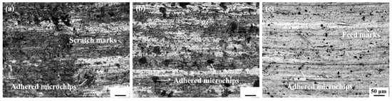 The surface morphology of turning blocks under different preheating temperatures is shown in Figure 5. The cutting surface defects mainly include feed marks, scratch marks, and adhered debris [22]. Feed marks are unavoidable defects caused by tool contact with turning material. This defect is the main cause of changes in surface roughness, which will be analyzed in detail in the next section. Scratch defects are caused by high-speed moving cutting debris and machining surface collision friction. As the preheating temperature of the substrate increases, the cutting process becomes easier under the influence of the thermal softening effect of the substrate. The interaction between the debris and the substrate weakens, and the scratches gradually disappear. Moreover, the generation of adhesive debris is due to the accumulation of debris in the tool gap during the cutting process, which falls off and adheres to the surface of the workpiece under pressure and friction in a high-temperature environment, causing a serious impact on the surface quality. As shown in Figure 5a, many irregular adhesive debris defects appeared on the sample’s surface at 25 °C. As the preheating temperature increases, the number and size of these adhesion defects decrease, and their shape gradually becomes regular. This is because, at higher temperatures, the thermal softening effect of the sample improves the shaping of the surface to be processed, reducing the degree of shear slip damage during the turning process. Debris tends to fall off in continuous strips, resulting in a significant reduction in the amount of debris adhering to the surface of the sample [25].