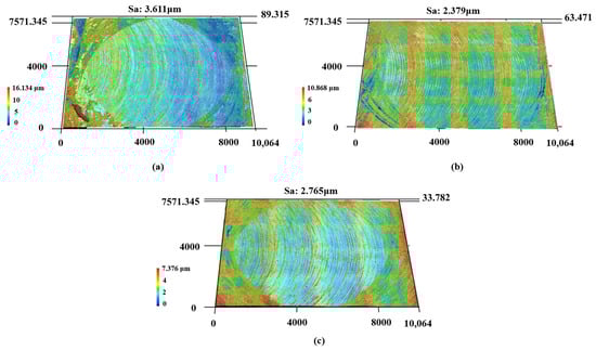 At a preheating temperature of 25 °C, the stress concentration at the tip of the tool induces significant shear slip between the workpiece and the tool head. As a result, the tool tip exhibits noticeable wear and a dull appearance. Correspondingly, the surface roughness of the machined workpiece is observed to be substantial. As the preheating temperature is elevated to 100 °C, the surface tip of the blade remains largely undamaged, with only minor debris adhering. Consequently, the surface quality improves markedly, and the surface roughness is effectively minimized. When the preheating temperature is 200 °C, the bonding wear between the tool and the substrate material causes the tool coating to bond with the tool substrate material. Furthermore, the elevated temperature and pressure during the cutting process result in the accumulation of continuous debris within the gaps of the cutting heads, thereby increasing the thickness of the material bonding layer along the side edges of the tool [23]. This accumulation adversely affects normal cutting operations. Simultaneously, the surface roughness of the sample experiences a slight increase, and the surface displays ridge-like ripples. This phenomenon can be attributed to the adhesion of chips to the tool, which leads to fluctuations in cutting force and induces a wavy stress state on the surface [37,38]. This results in pronounced wavy features on the machined surface, as depicted in Figure 6c.