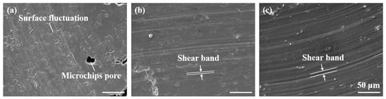 Temperature is the main factor affecting the surface morphology of cutting debris. Figure 7 shows the microstructure of cutting debris at different preheating temperatures. At 25 °C, microchip pores occur in the debris (Figure 7a), which is due to the large shear deformation during the milling process causing the chips to peel off under high cutting heat, resulting in the release of heat. Moreover, due to the severe thermoplastic instability of the material during the cutting process, the degree of slip on the machined surface is large, resulting in surface fluctuations of debris, which also affects the surface roughness of the machined surface [28]. As the preheating temperature of the substrate increases, continuous shear bands appear on the free surface. This type of adiabatic shear band originates from a rapid plastic deformation process, which generates heat that cannot be dissipated in time, limiting the shear action to the cutting surface. At a preheating temperature of 200 °C, the thermal softening effect of the processed sample promotes smoother thermal deformation of the substrate, resulting in less shear slip deformation and uniform shear bands on the free surface of the debris.